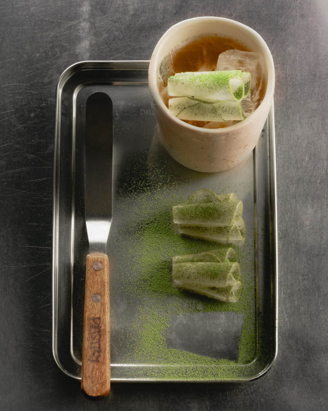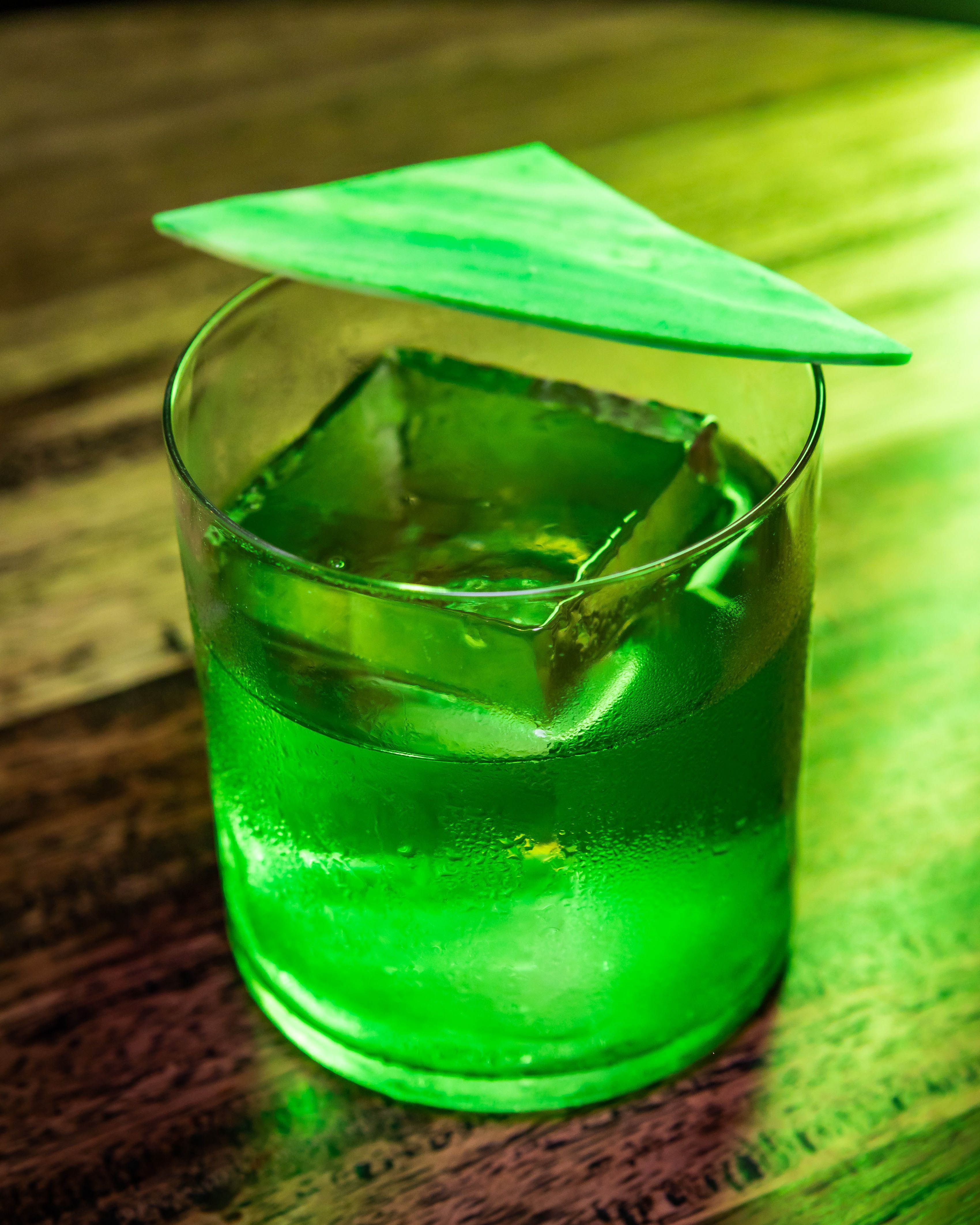 Ingredients: Suze, clarified kiwi, distilled oyster shell gin, lemon and poblano kosho, blackcurrant leaf.