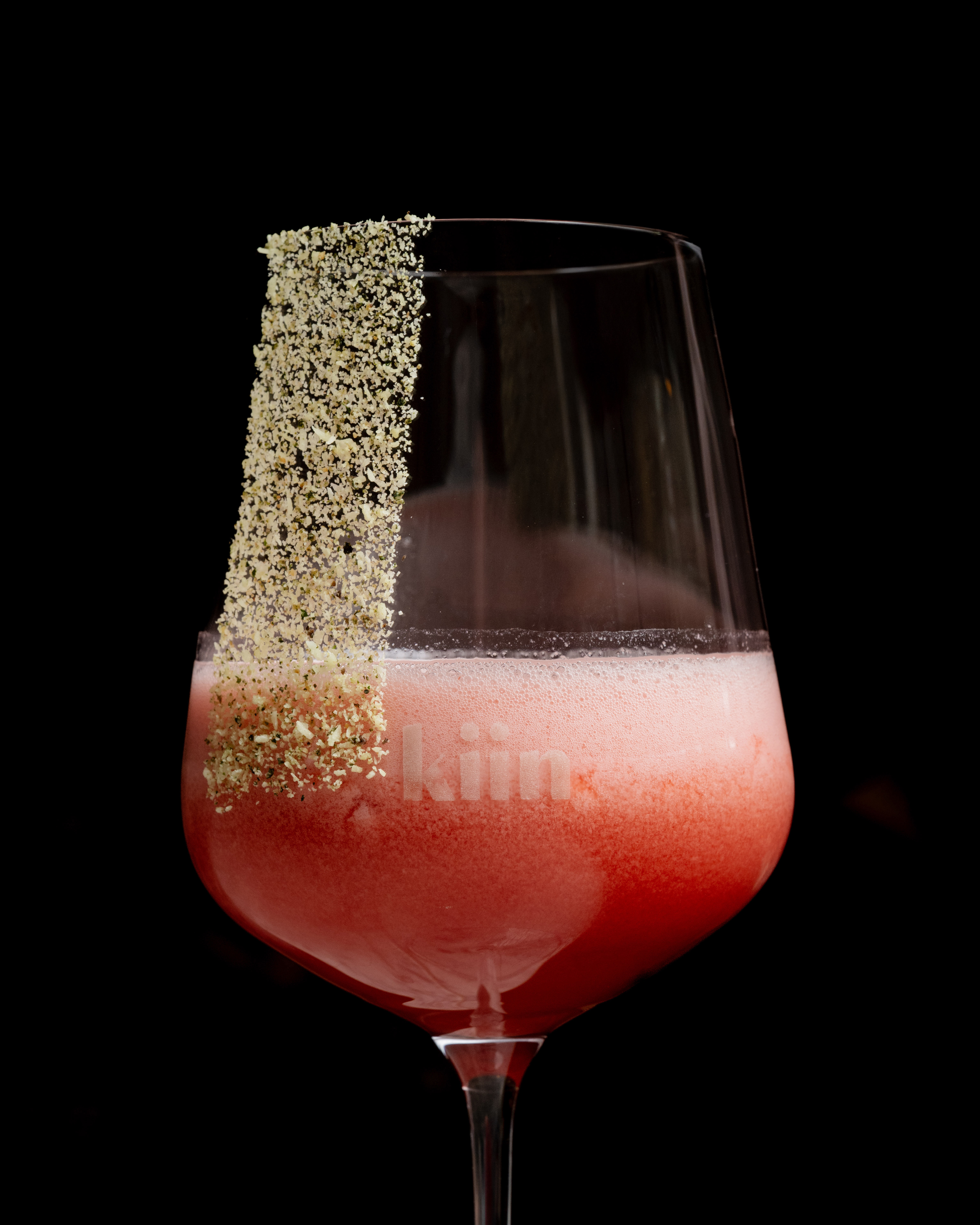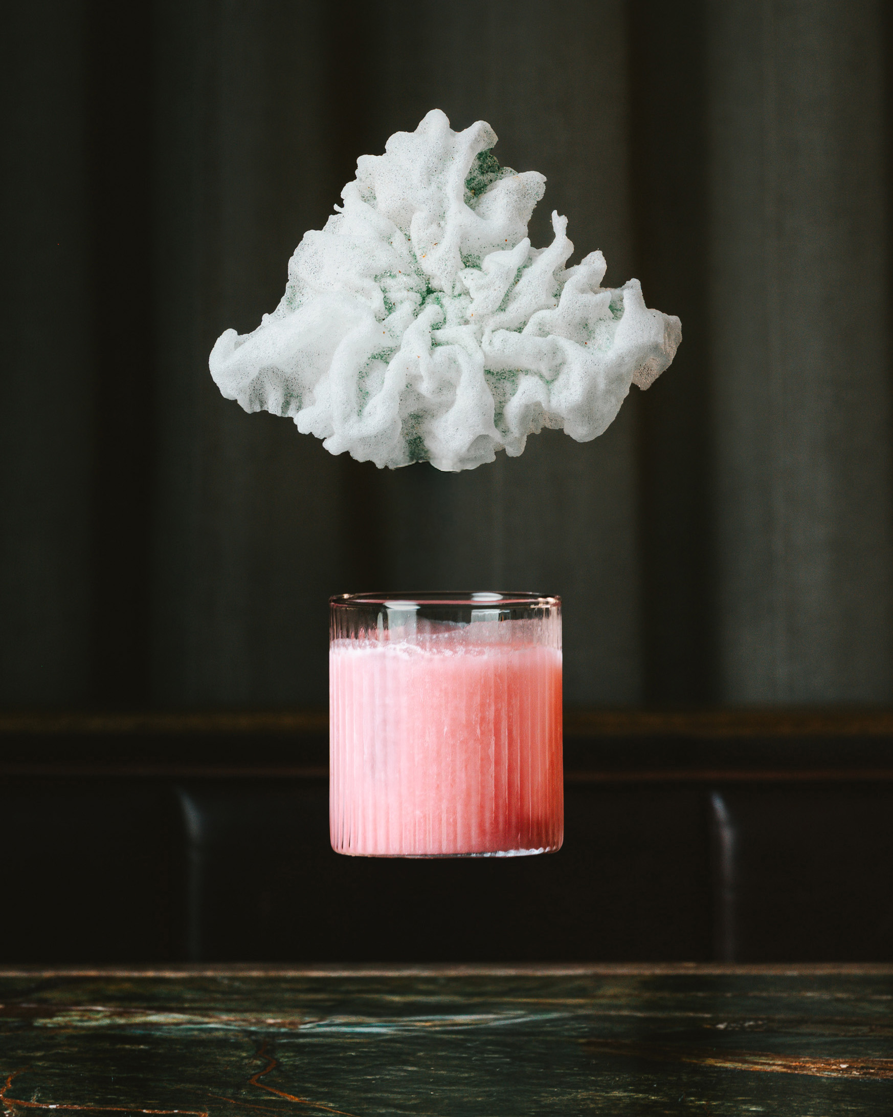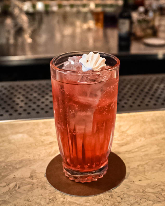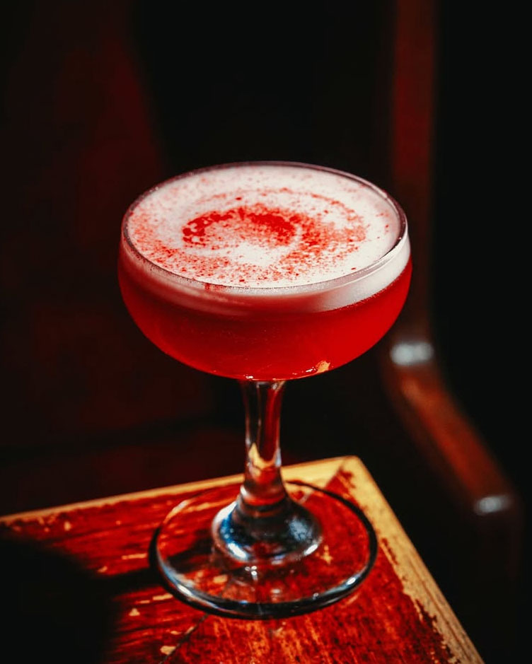 Ingredients: Raspberry-infused vodka, Rhubi, lemon juice, cardamom syrup, foam, edible glitter, raspberry powder.