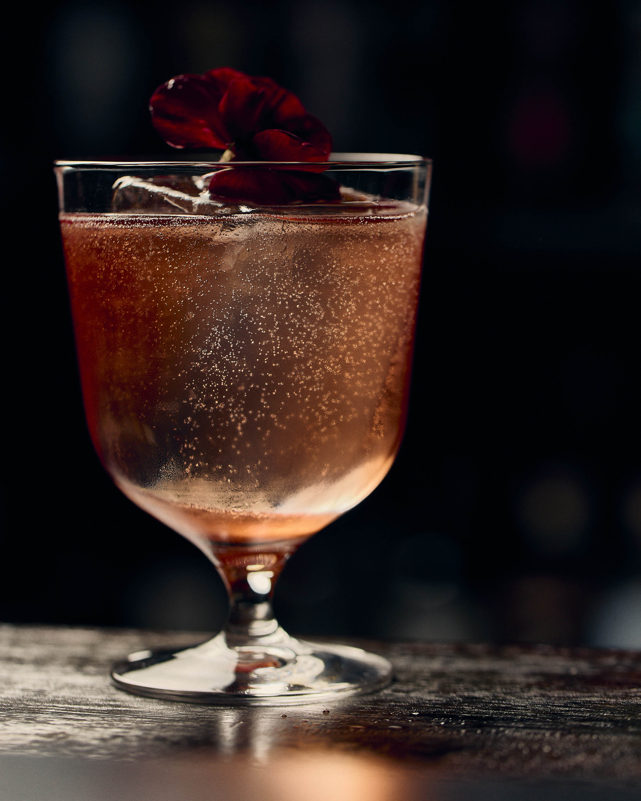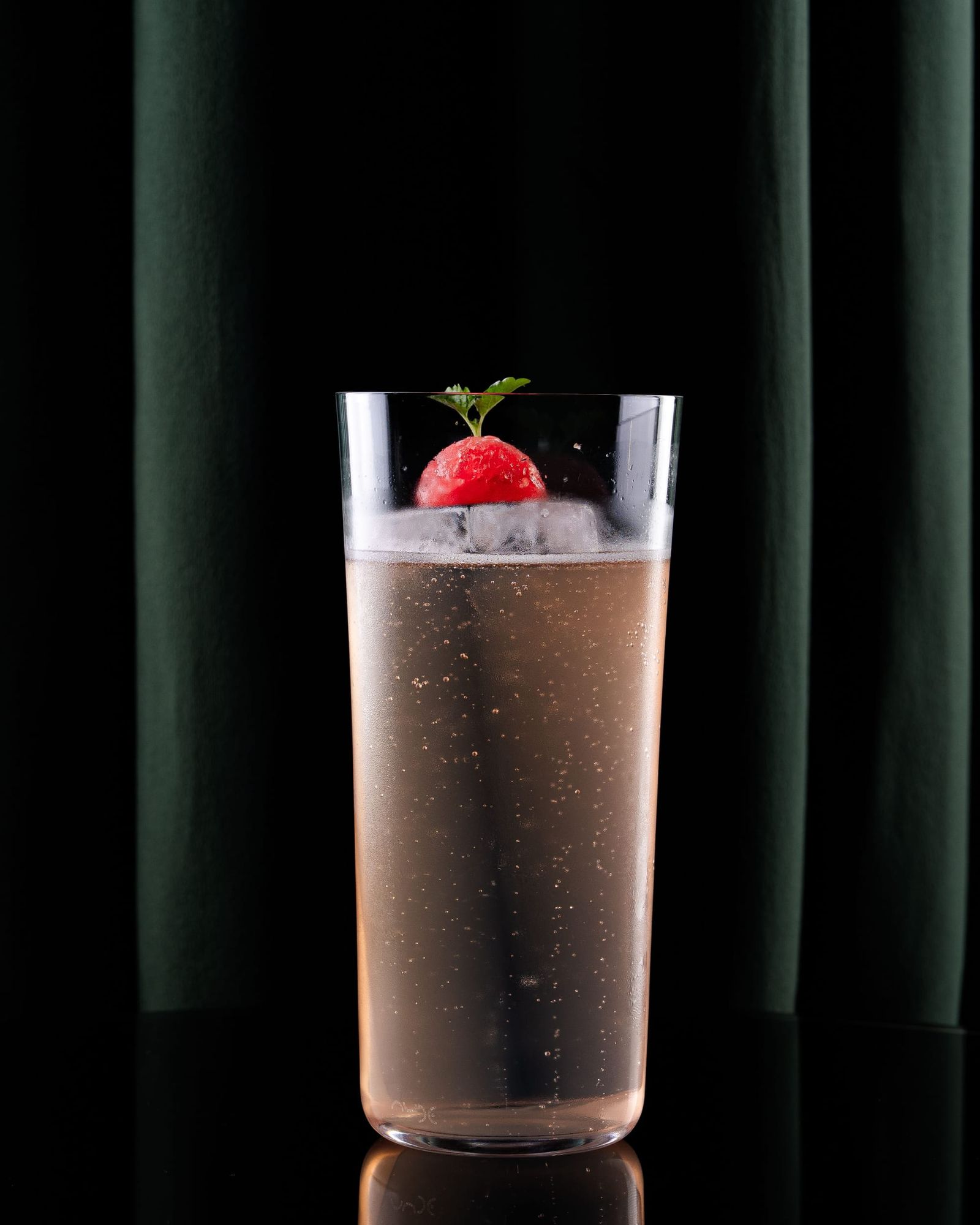 Ingredients: Vodka, Rhubi, strawberry wine, champagne acid, hibiscus honey, finger lime soda.
