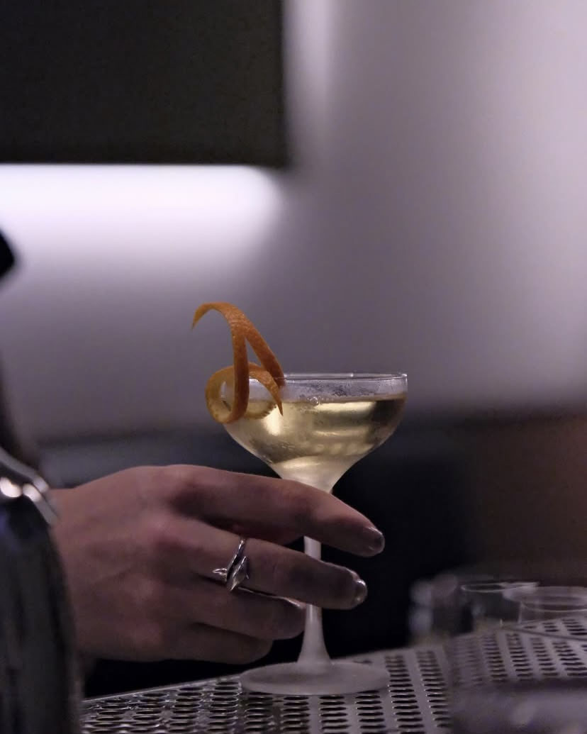 Ingredients: Arak, gin, bianco vermouth, curacaso, lemon bitters, garnished with lemon and orange zests, or Tom Sarafian gilda.