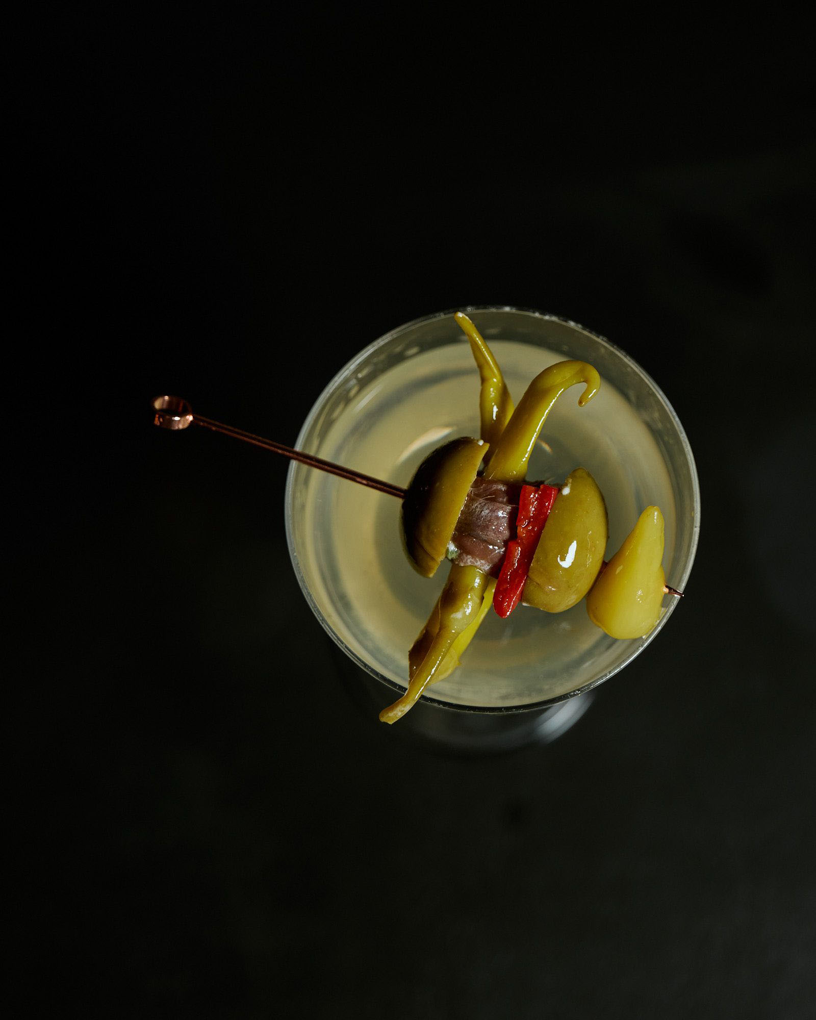 Ingredients: Oyster shell gin, jalapeno distillate, dry vermouth, onion infusion, Chartreuse.