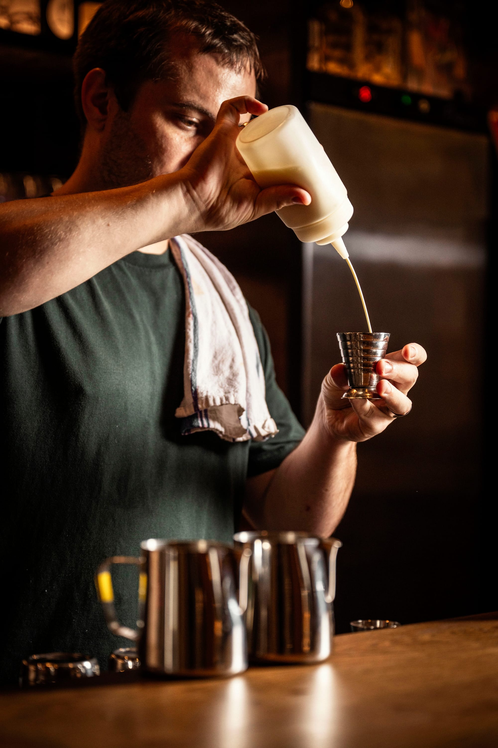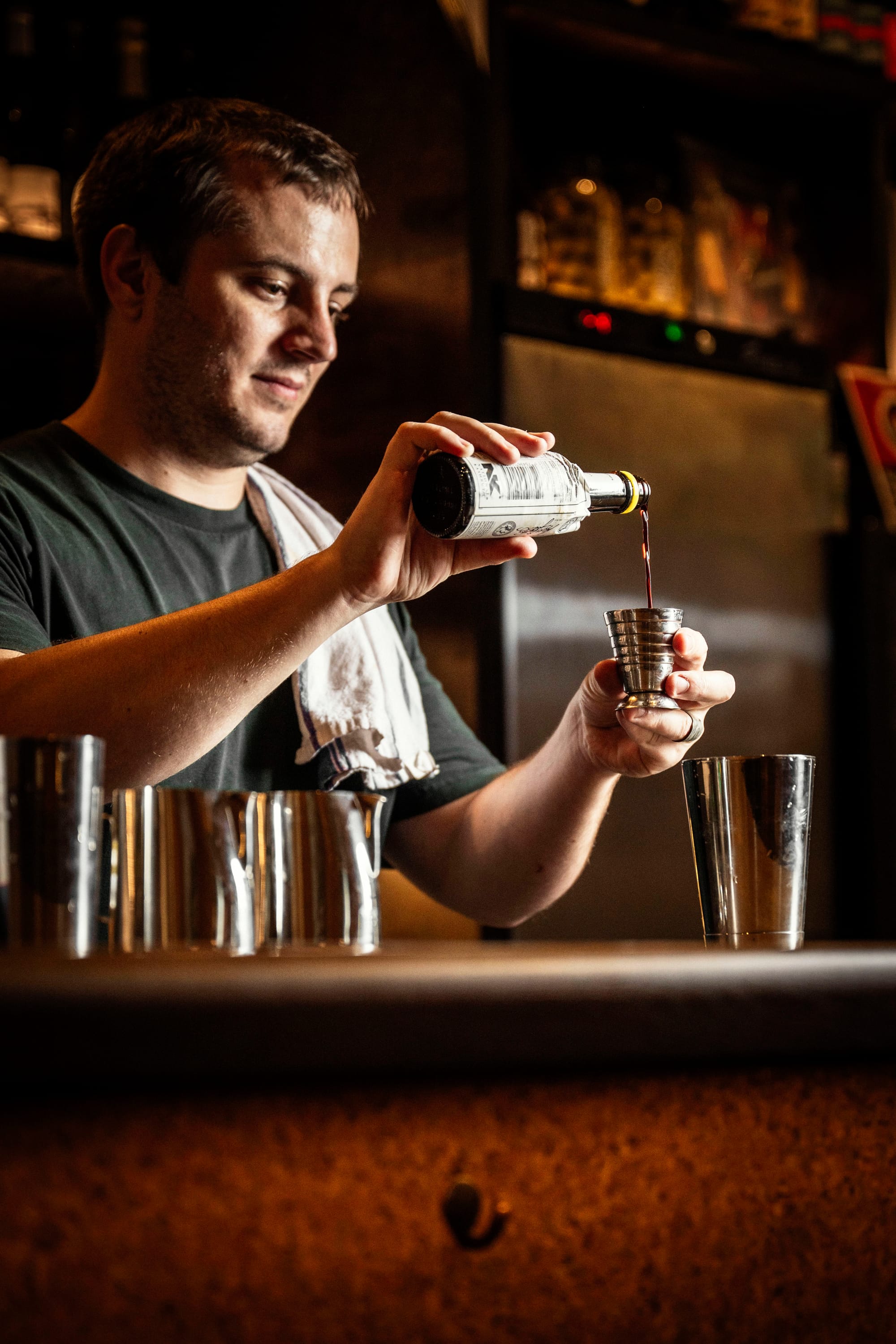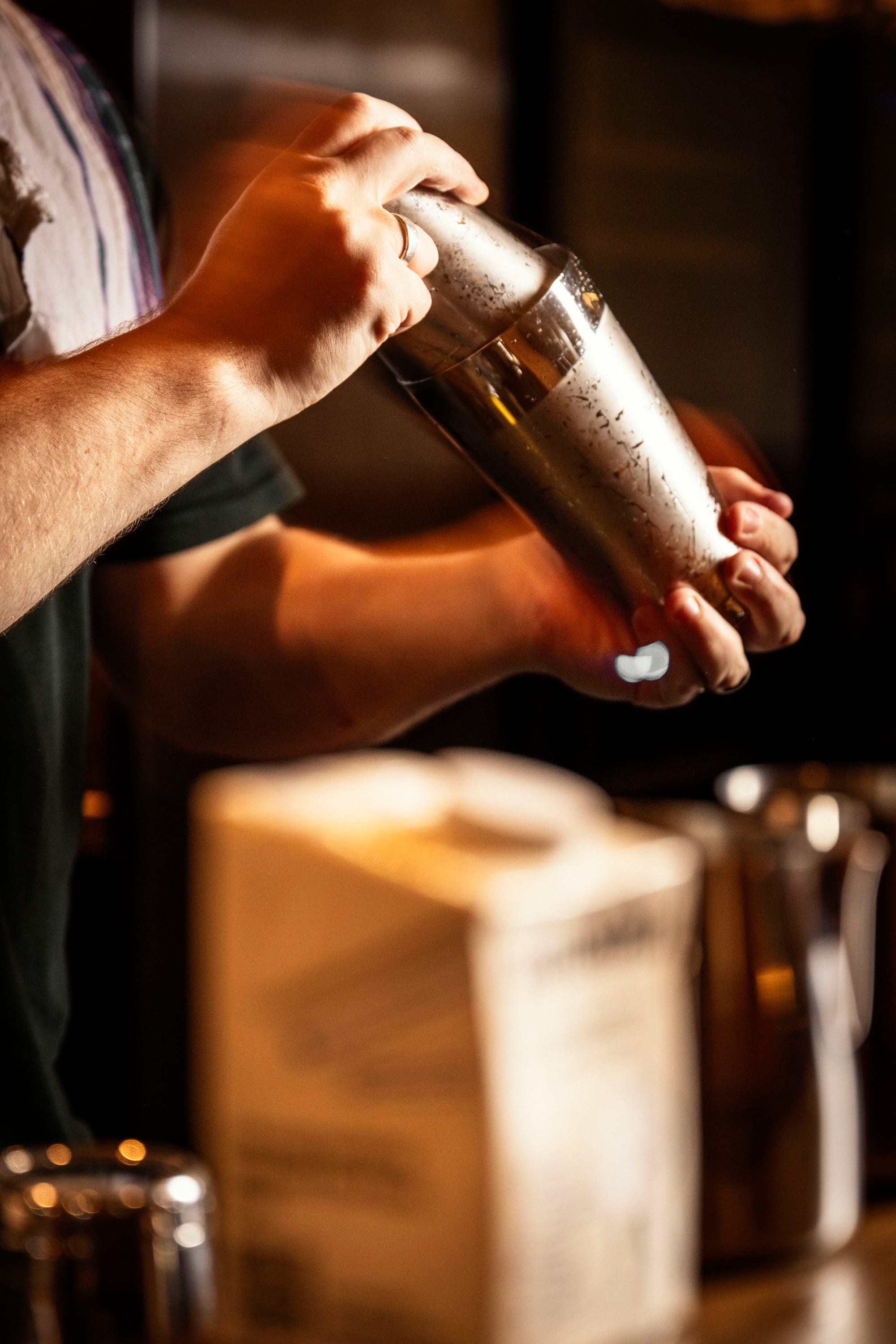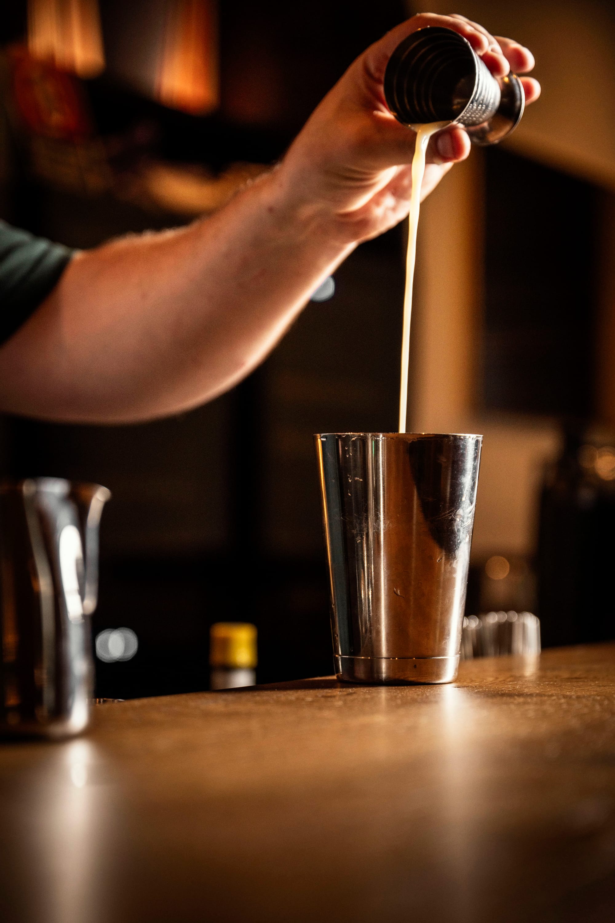 - Pop a healthy pour of aromatic bitters into your shaker tin.