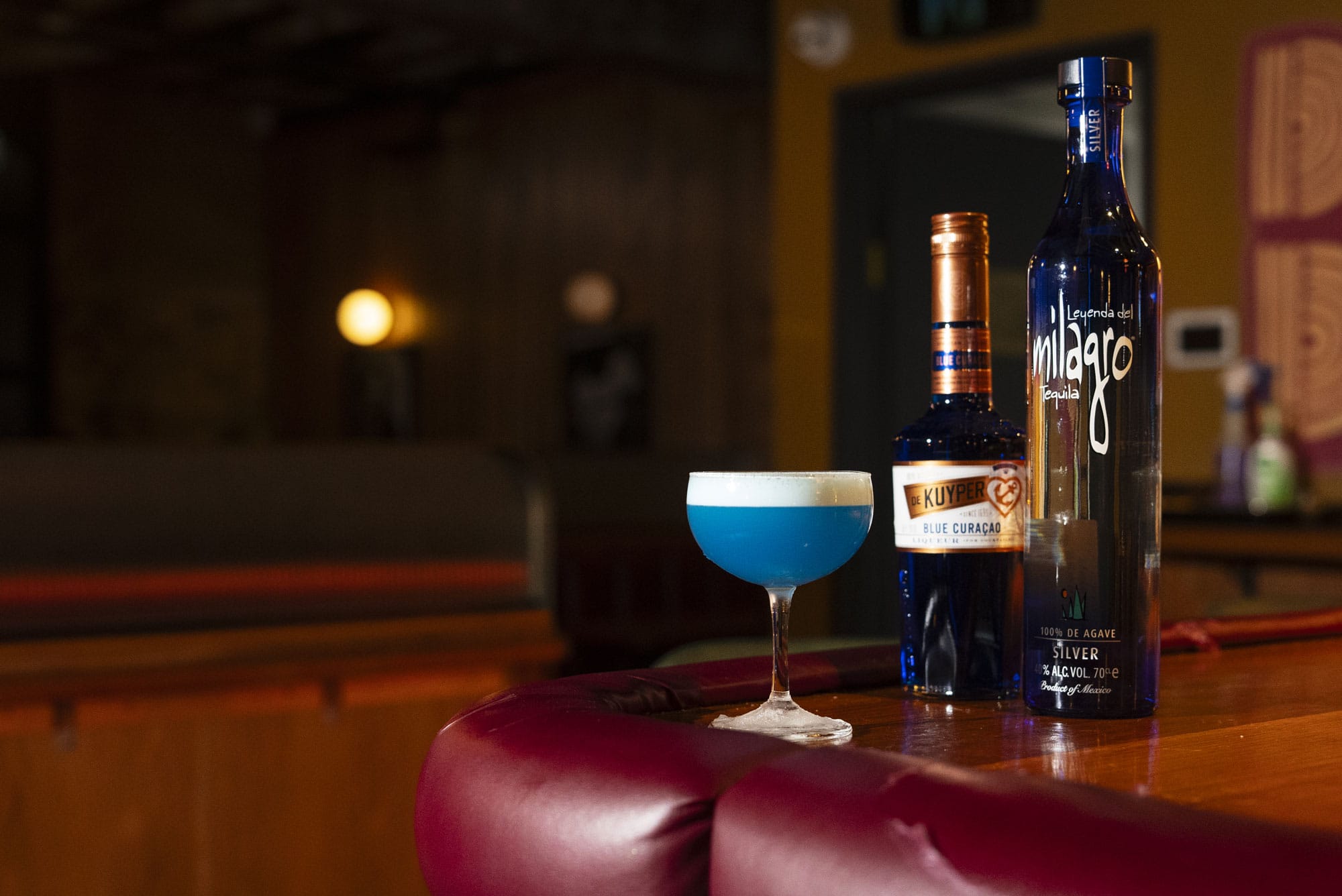 So we’ve moved from the White Lady to the Blue Lady — all that’s left to do is remove the gin, and put in the Milagro Silver tequila in its place.