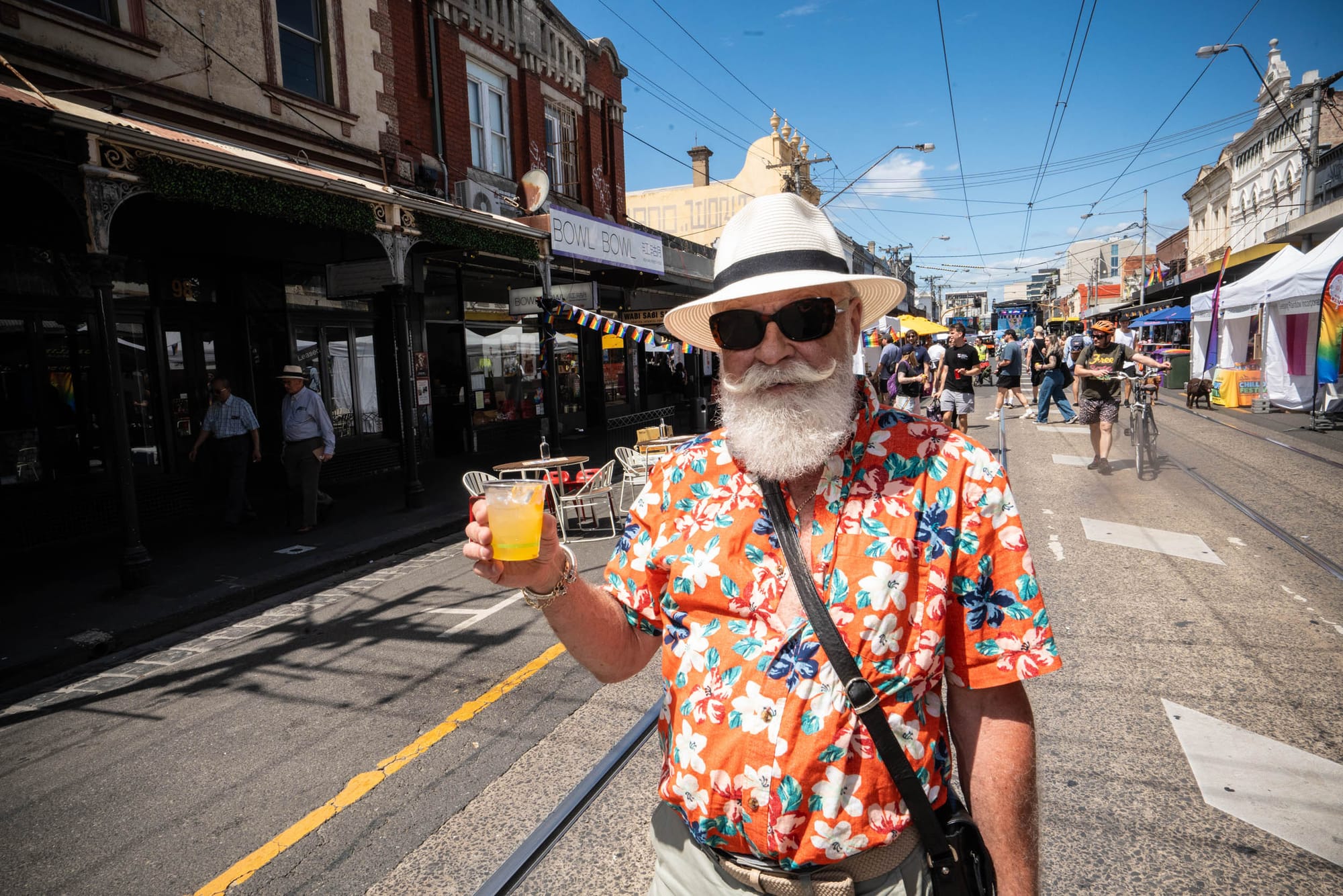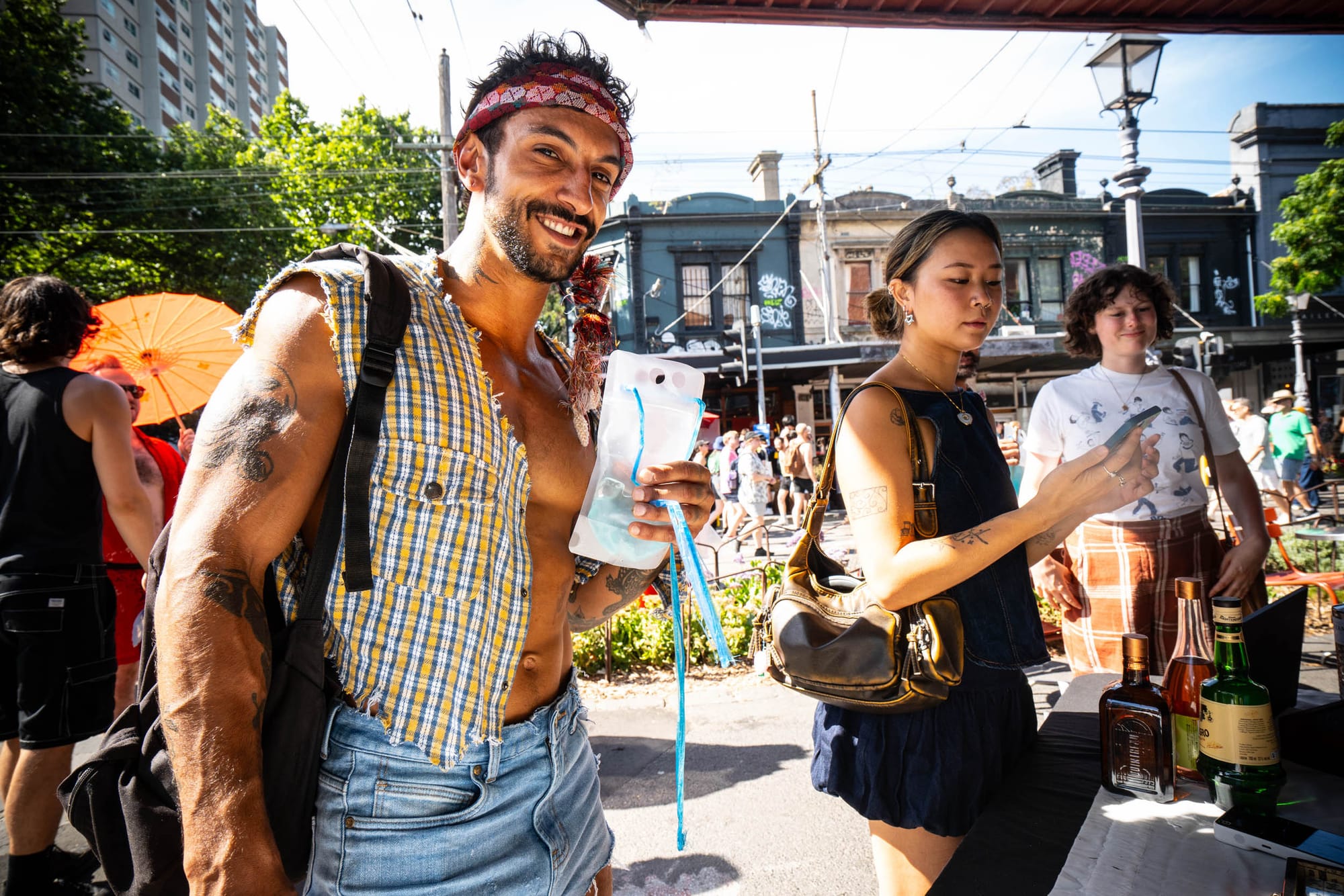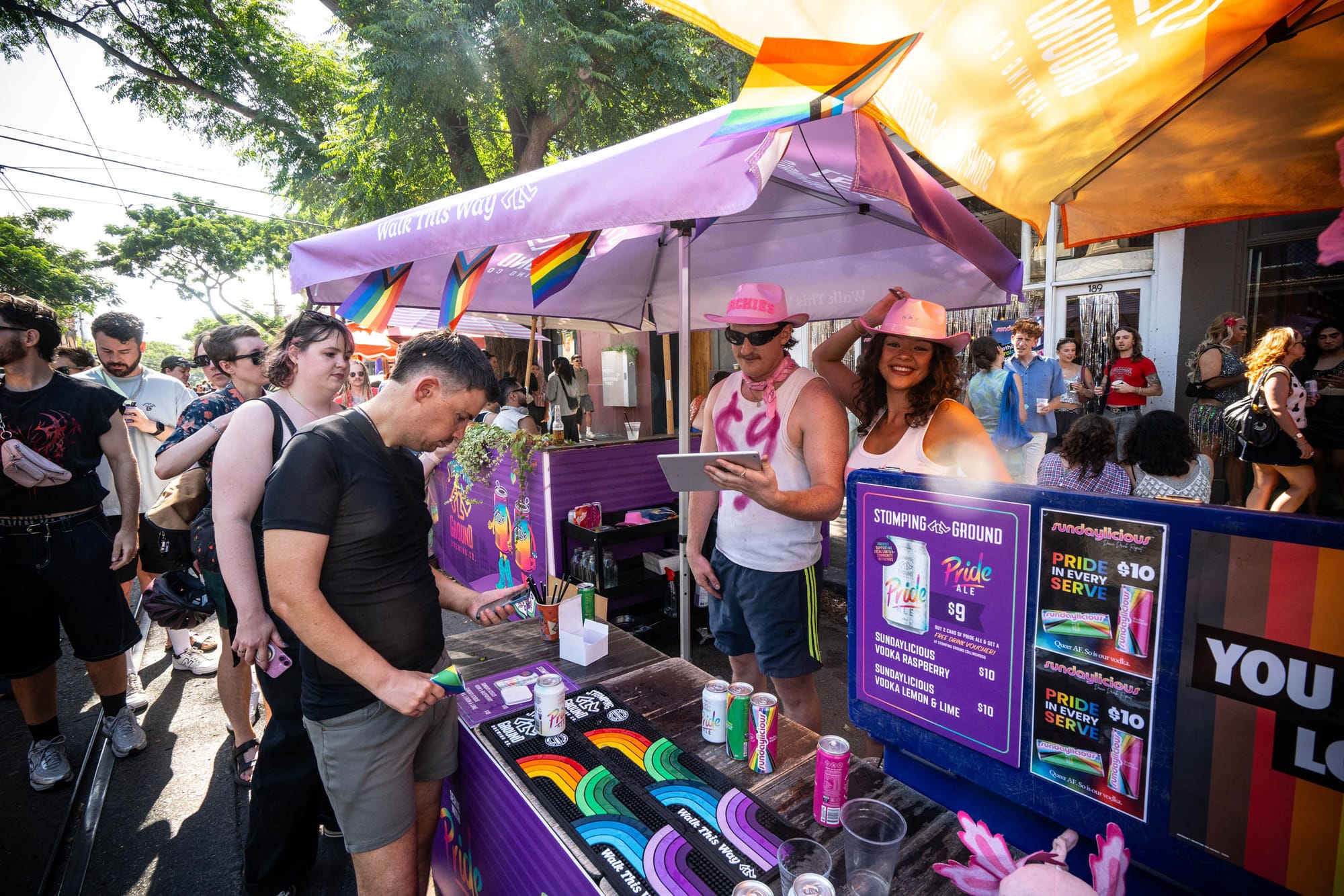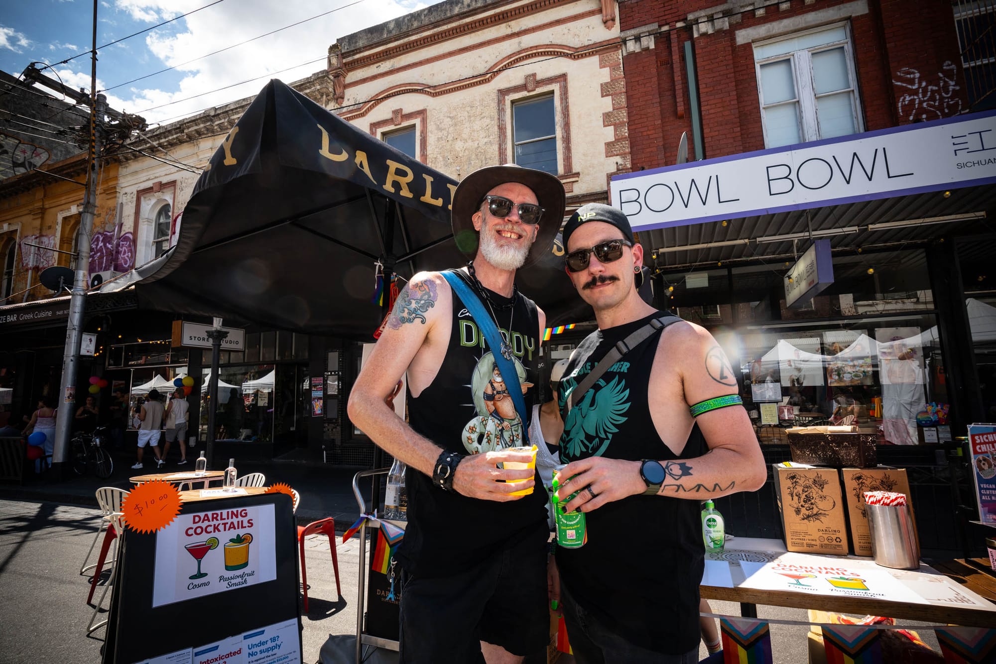 This early in the day, things are just getting started, as the bars, pubs, clubs, cafes and restaurants are setting up for what looks like it’s going to be a huge shift. The Builders Arms is set with frozen Margies inside, and a stand outside doing snags and Stomping Ground Pride Ale, while the Fitzroy Beer Garden has a phalanx of slushie machines ready to go, filled with frozen Pornstars and Watermelon Margaritas, and there are drinks stands set up in front of pretty much every venue. Everyone from the Turkish kebab shops to the Japanese izakayas to the couture optometrist are on board to celebrate, and it’s wonderful to see the whole community out and loud and proud, beaming and preening in the summer sun.