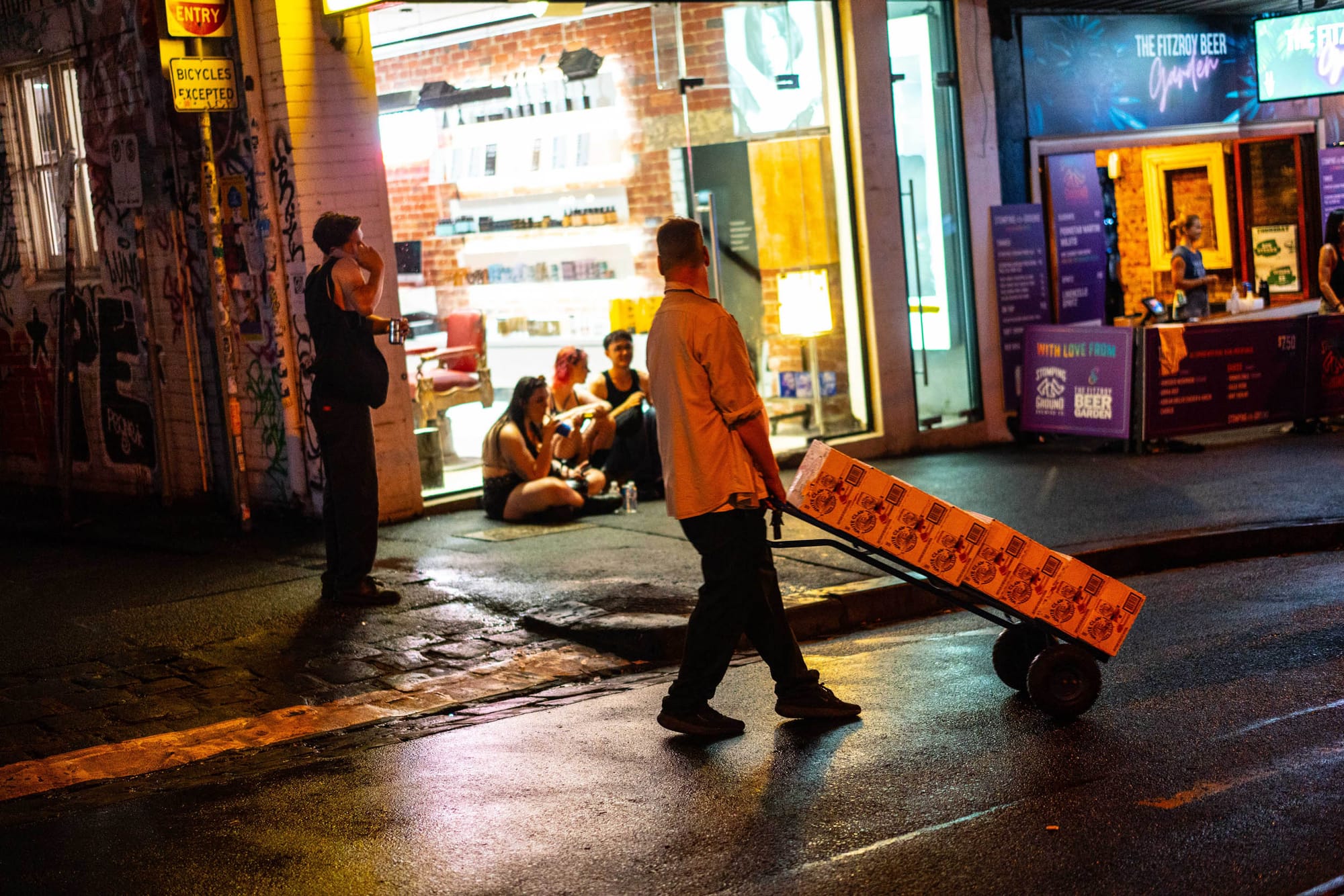 While most of the stalls have packed up, the DJs are still playing outside the Gertrude and The Builders, and the dance floors are heaving. The top balcony of a classic Fitzroy two story terrace overlooking the sweaty, gyrating crush has an epic vantage point, and the crew at Fitzroy Beer Garden are restocking for the night to come.