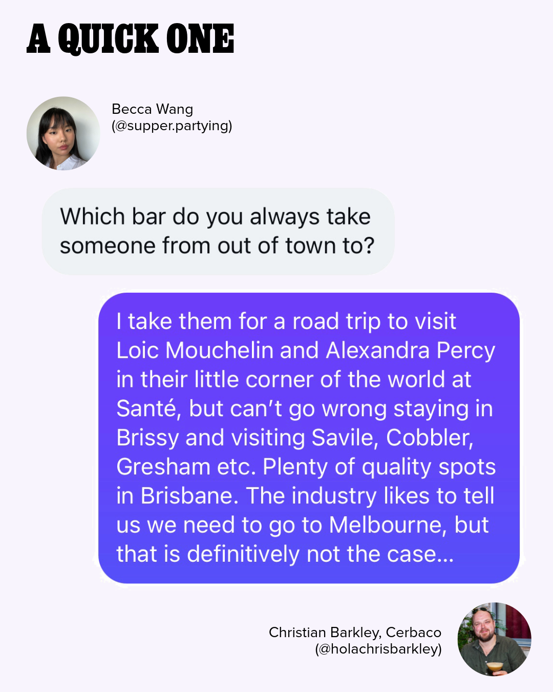 If you have info the Brisbane bar community should know, please email me contact@beccawang.com.au or send me a message via Instagram (@supper.partying).