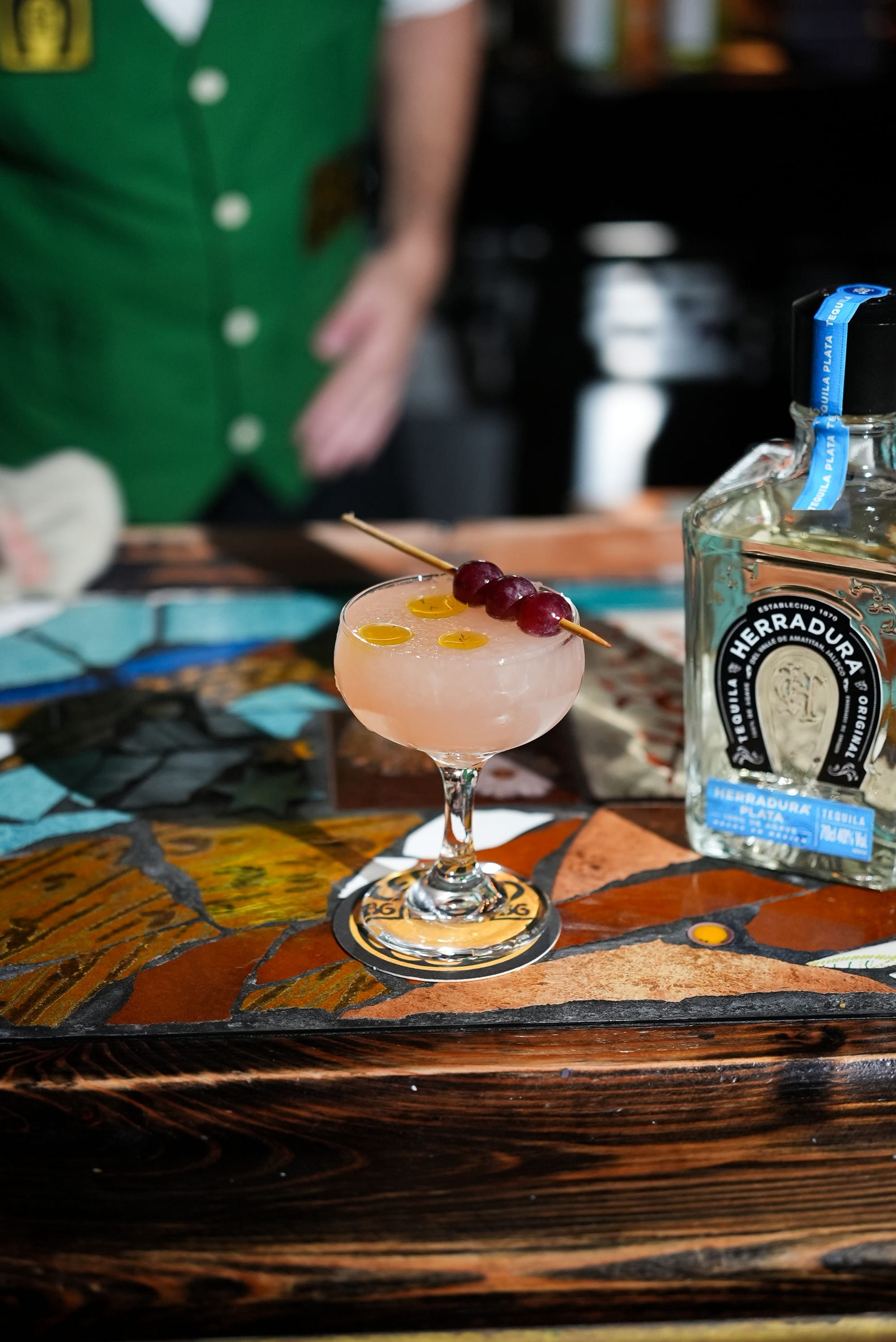 And as we sat with [Mucho Group creative director] Jeremy Blackmore and the rest of the team, sipping Herradura Plata, we all came up with this summery vibe, some textured fresh red grapes, summer picnic, and we leant into that with this fresh thyme oil, fresh red grapes muddled in there and a little daggy faux Martini garnish.