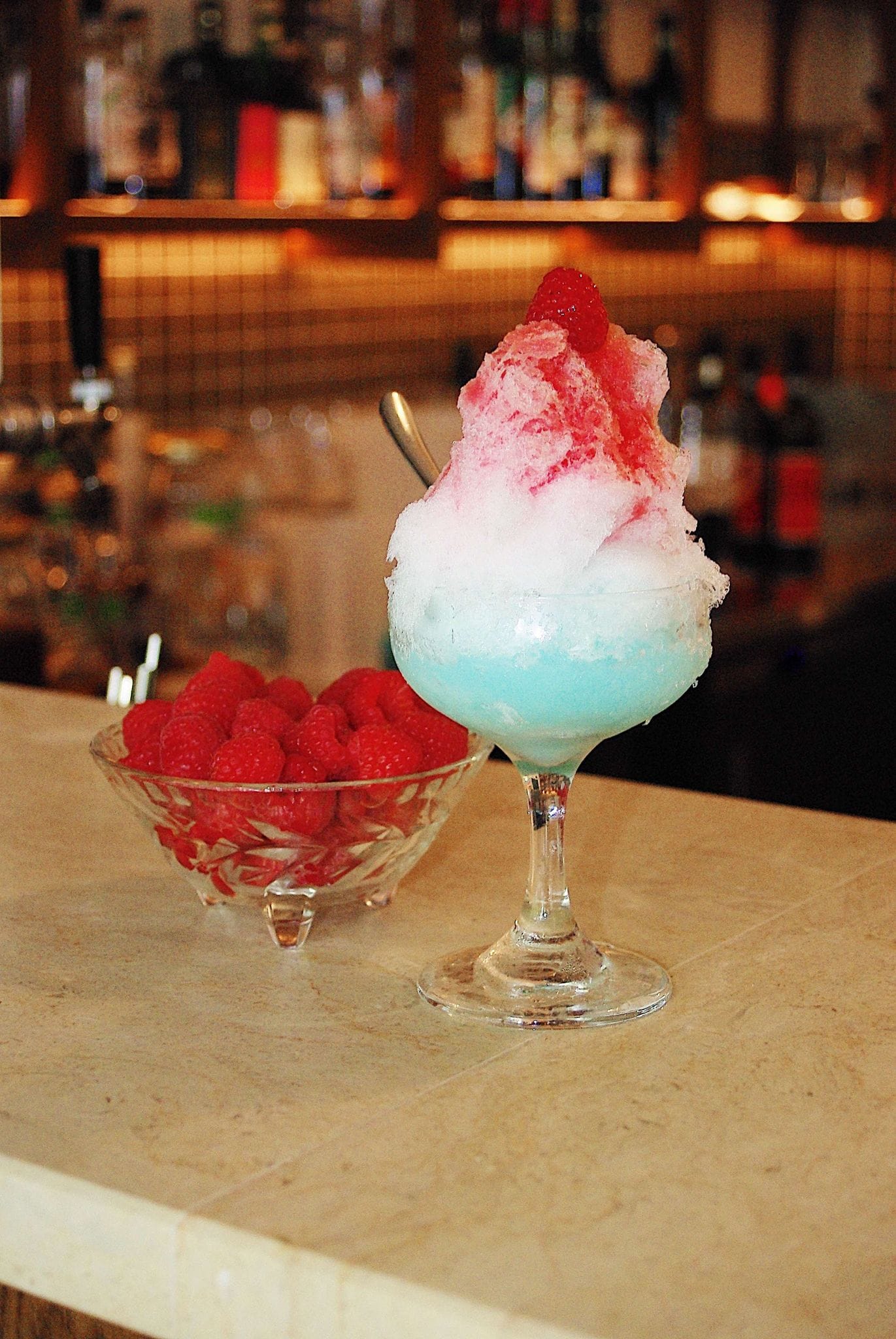 Ingredients: Raspberry, butter & vanilla distillate, blue curacao, calpis concentrate, lemon juice, fluffy ice.