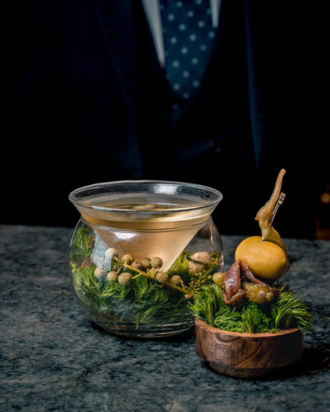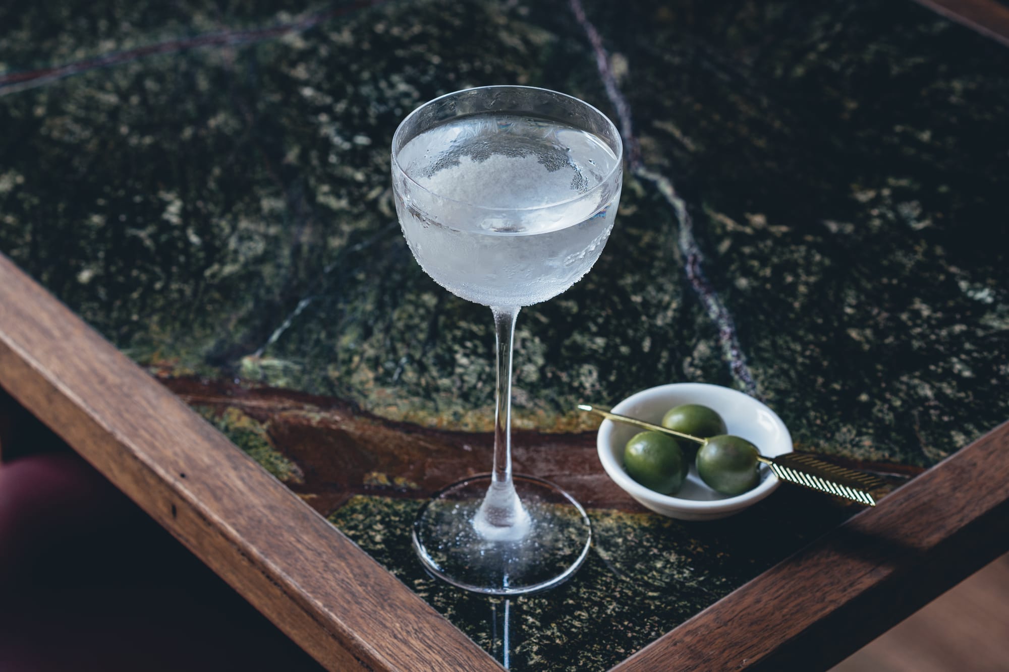 A Martini celebrating oysters with coastal gin and an oyster-inspired olive.