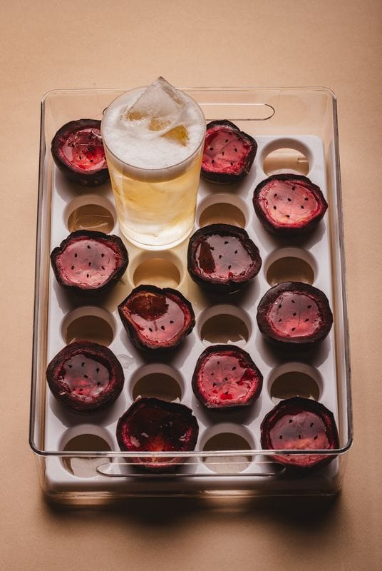Ingredients: Agave spirit, distilled ponzu, ghost chilli, banana amazake, tomato saline, clarified tomato
