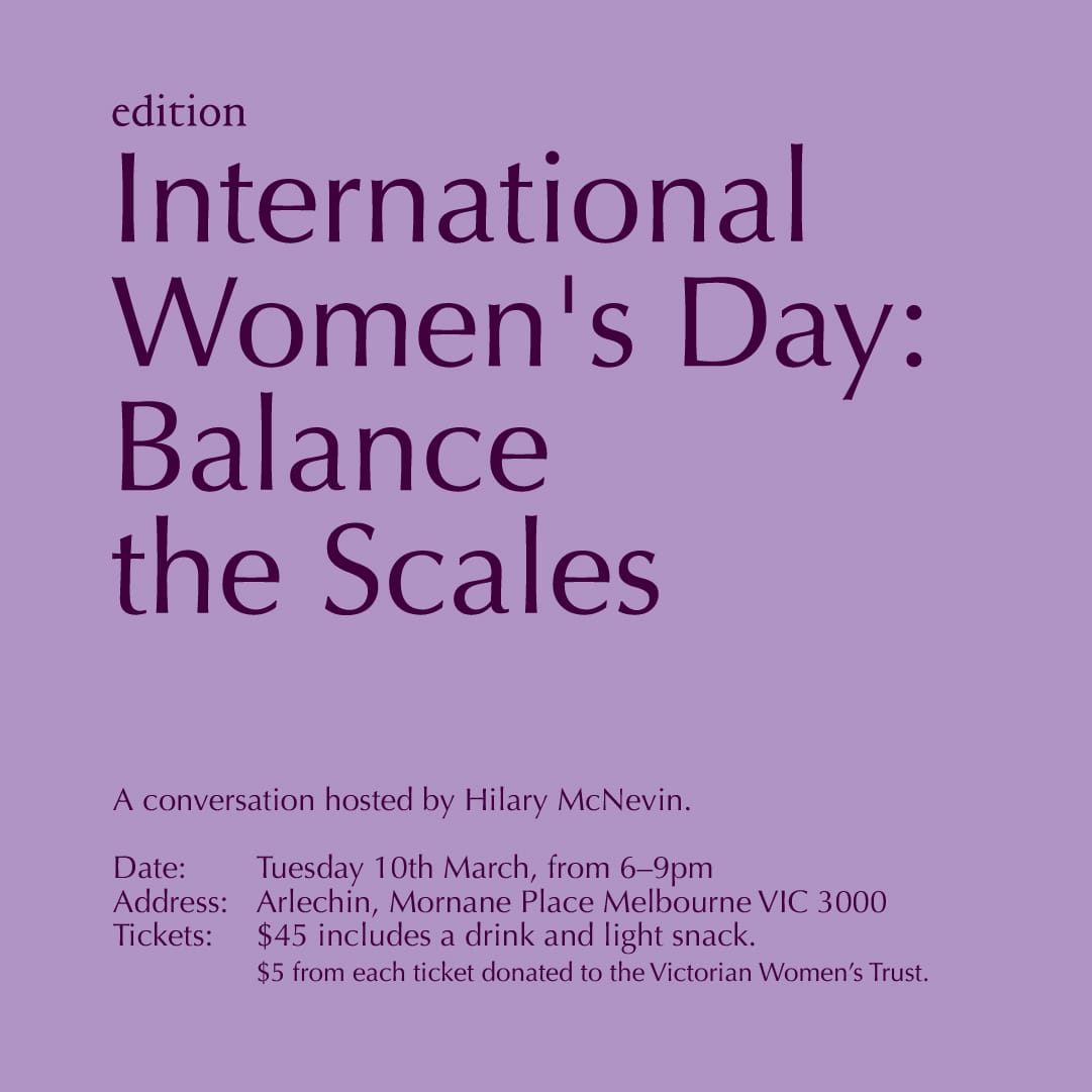 The theme for the 2026 panel is "Balancing the Scales” and will be held at Arlechin on Tuesday, 10 March. Tickets include a drink on arrival and light snacks by Kay Lene-Tan, executive pastry chef at Omnia bistro, with $5 from every ticket donated to the Victorian Women's Trust. (Get yours here.)